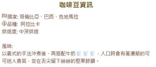 咖啡盒裡每包咖啡都充滿著香郁口味,完美展現出豐富香醇口感,更帶著煙熏香氣特色。適合喜歡濃郁咖啡誘惑的朋友。