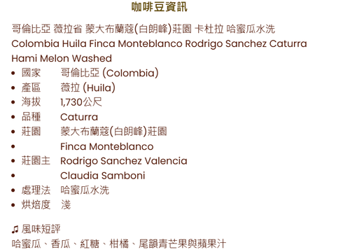 C15 Colombia Huila Finca Monteblanco Rodrigo Sanchez Caturra Hami Melon Washed