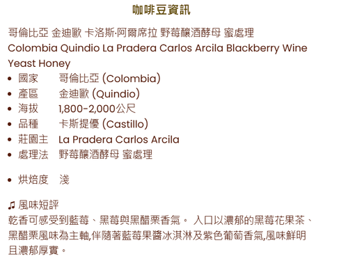 C25 Colombia Quindio La Pradera Carlos Arcila Blackberry Wine Yeast Honey