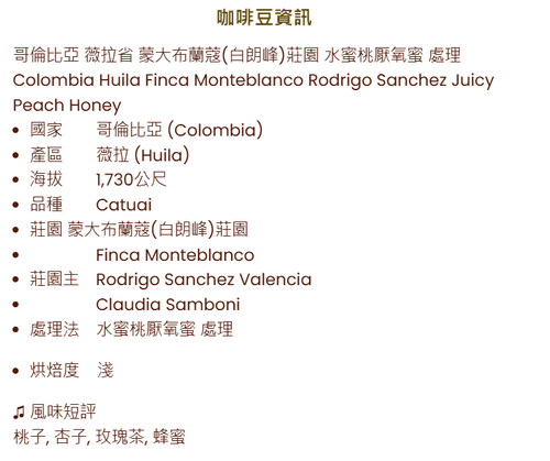 C34 Colombia Huila Finca Monteblanco Rodrigo Sanchez Juicy Peach Honey