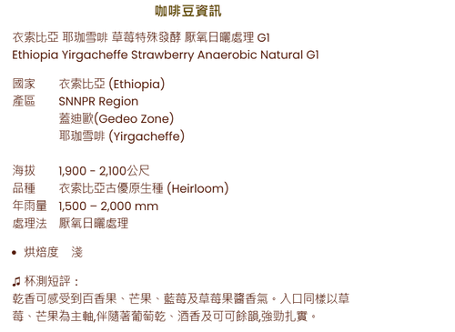 check_circle 200g 原豆 Whole beancheck_circle 淺度烘焙 - 酸質較強,突顯花香🌸果香🍓