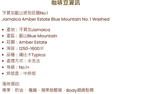 J2 Jamaica Amber Estate Blue Mountain No. 1 Washed 藍山咖啡豆