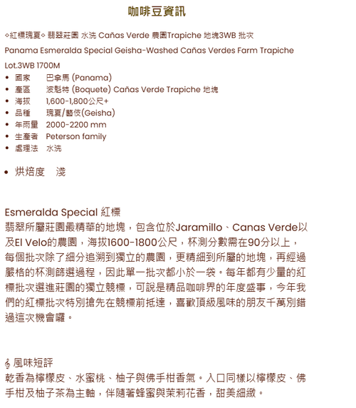 P58 Panama Esmeralda Special Geisha-Washed Cañas Verdes Farm Trapiche Lot.3WB 1700M 巴拿馬翡翠莊園紅標藝妓咖啡豆
